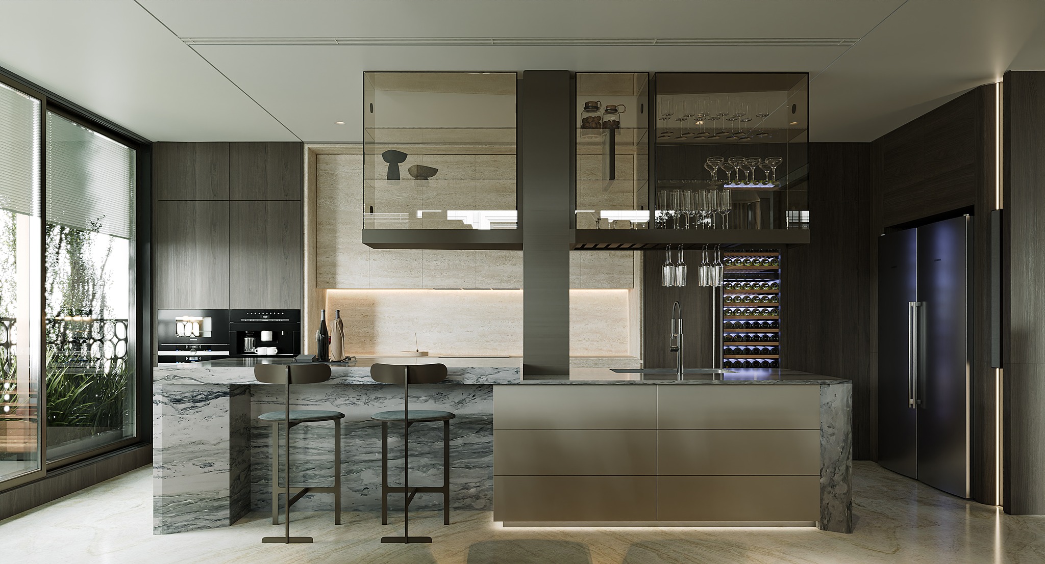 Quan trọng hơn, toàn bộ hệ thống kỹ thuật được tích hợp một cách tinh tế vào kiến trúc nội thất, đảm bảo không làm ảnh hưởng đến thiết kế tối giản và cao cấp của công trình. Kết quả là một không gian sống hài hòa giữa thẩm mỹ, công nghệ và sức khỏe, đúng với tiêu chuẩn của một công trình biệt thự siêu cao cấp.