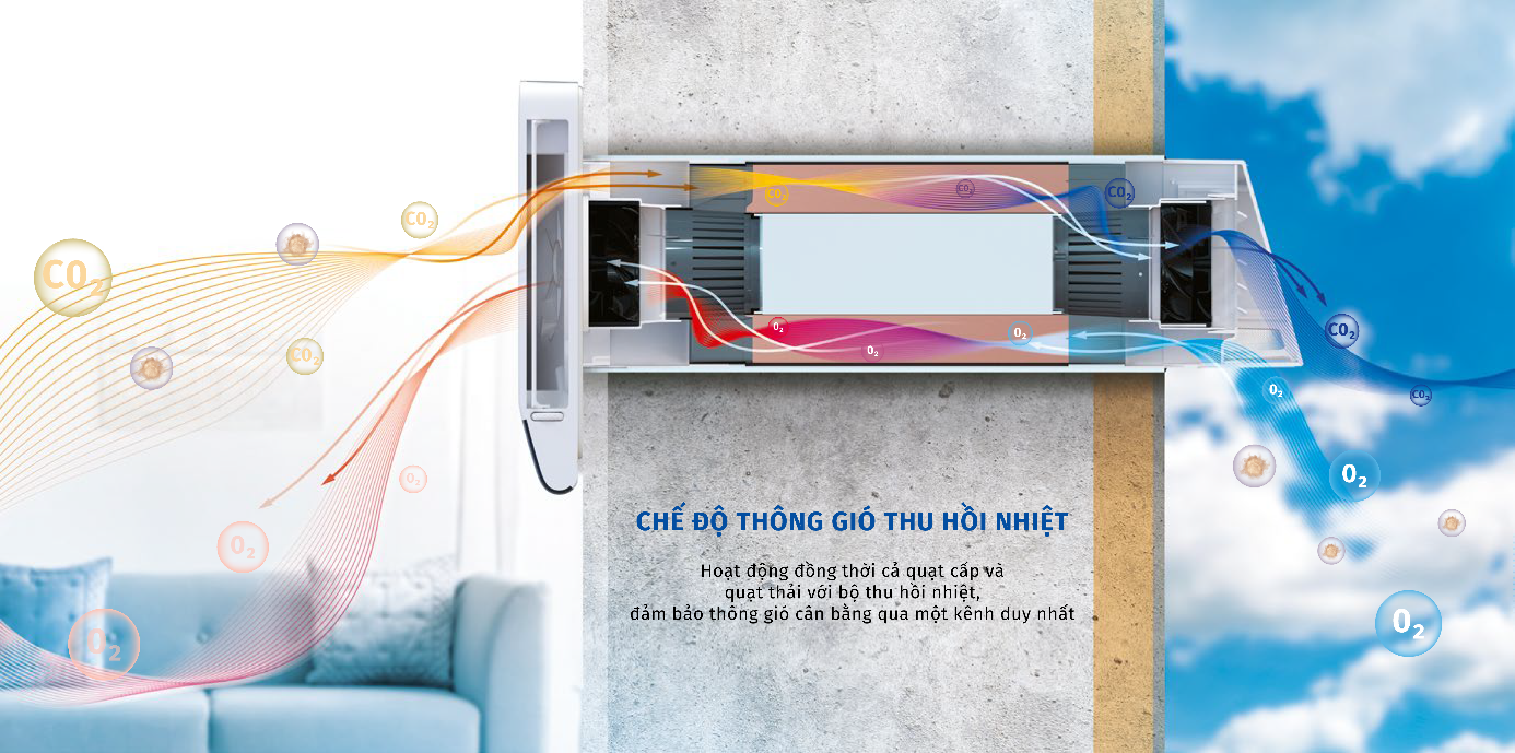 Chế độ thông gió thu hồi nhiệt: Hoạt động đồng thời cả quạt cấp và quạt thải với bộ thu hồi nhiệt, đảm bảo thông gió cân bằng qua một kênh duy nhất.
