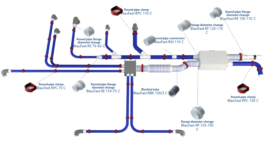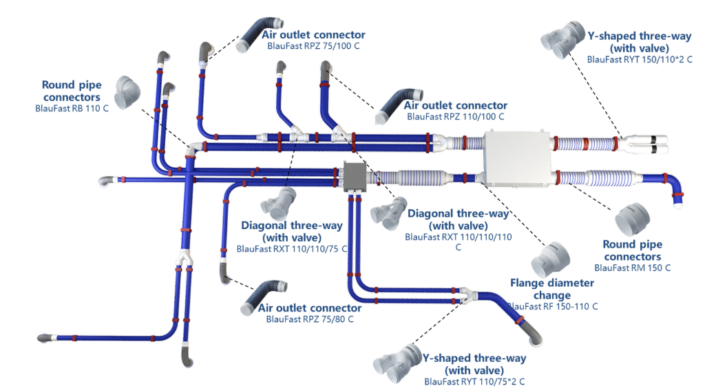 Blaufast là hệ thống ống gió nhựa HDPE nguyên sinh và phụ kiện đồng bộ, được thiết kế theo dạng module lắp ghép, chuyên dùng cho các hệ thống thông gió cấp khí tươi và thông gió thu hồi năng lượng trong căn hộ, nhà ở và các công trình dân dụng cao cấp.